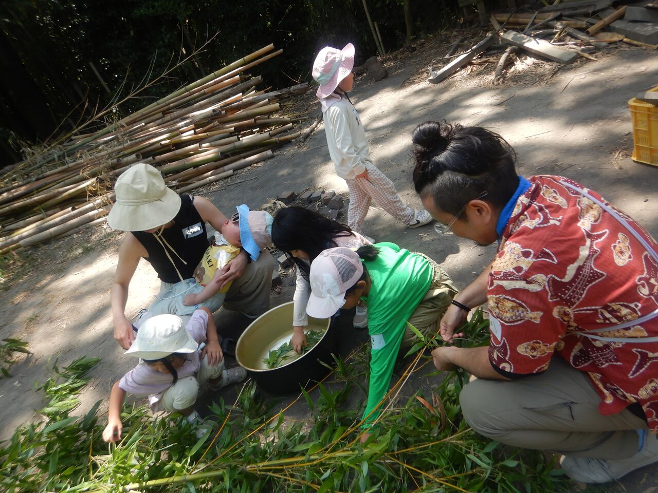 フィールドに一番多い、竹も、もちろん今日の主役の1人!みんなの分の絵の具になってもらうため、たくさんの葉っぱを集めます。採取しながら、昆虫が登場したら観察タイムになったり、葉っぱのいい香りにうっとりしたり・・・。